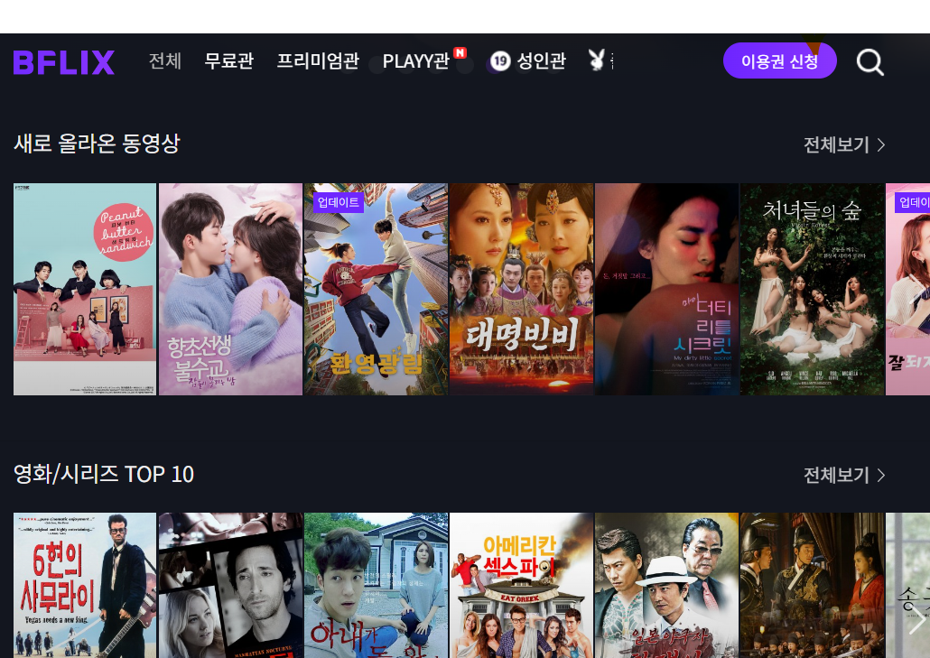 비플릭스는 누구나 무료로 영화를 볼 수 있는 무료관, 최신/인기 영화를 모아둔 프리미엄관, PLAYY관, 그리고 한국/일본/대만/해외 등 다양한 국가의 성인 영화를 모아둔 성인관 및 플레이보이TV관 등으로 영화관이 구분되어 있습니다.