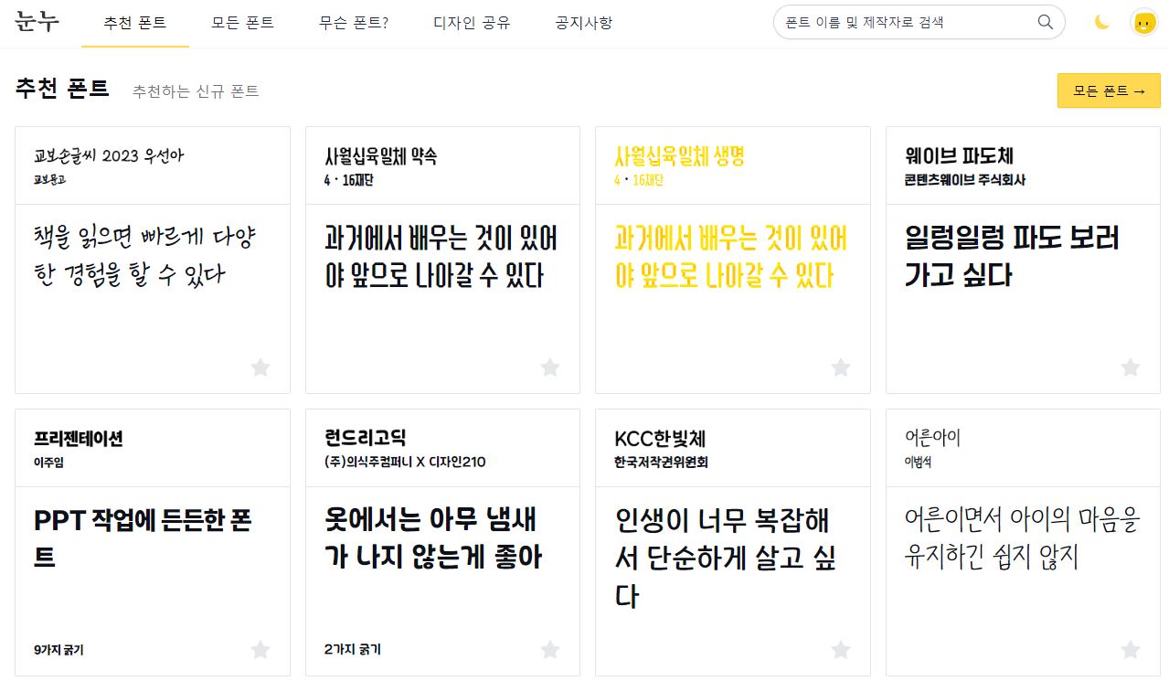 눈누는 팀눈누난나가 운영하는 무료 폰트 다운로드 사이트입니다. 제공하는 폰트가 정말 다양하고, 예시 문구를 적고, 크기, 굵기 등을 조절하여 디자인을 미리 확인해 볼 수 있는 기능이 있어서 좋아요.