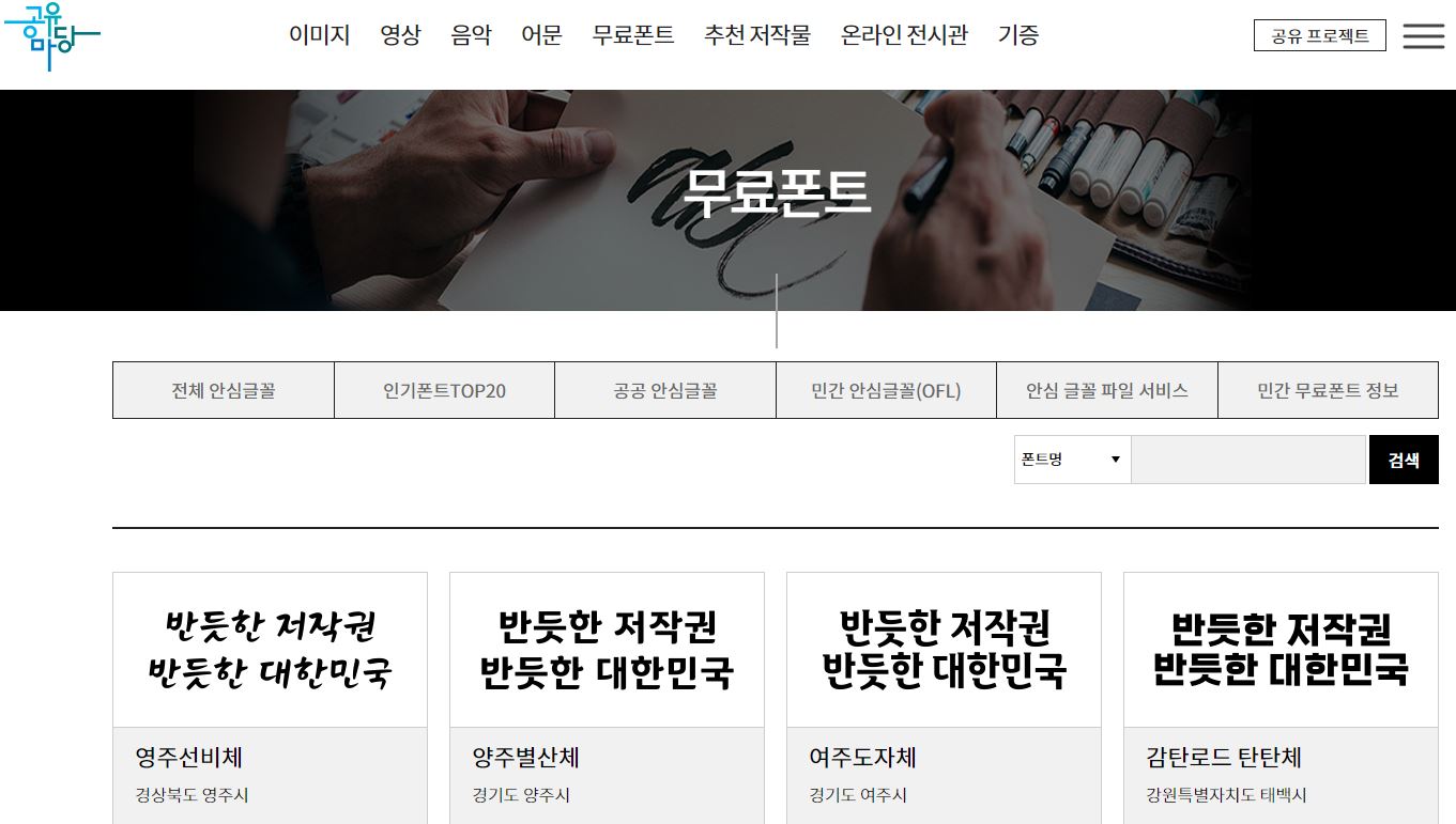 공유마당은 한국저작권위원회에서 운영하는 사이트로, 글꼴을 포함하여 이미지, 영상, 음악, 어문 등의 다양한 저작물을 이용할 수 있는 사이트입니다.